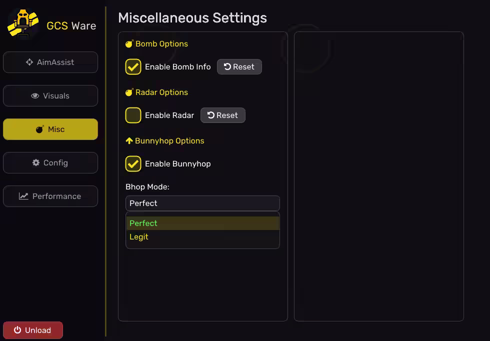 For movement, you get a Bunnyhop script with a “Legit” mode that misses perfect jumps occasionally to look human, or a “Perfect” mode for speed. The Misc tab also includes a Bomb Timer and an external Radar to track enemies without looking at walls.